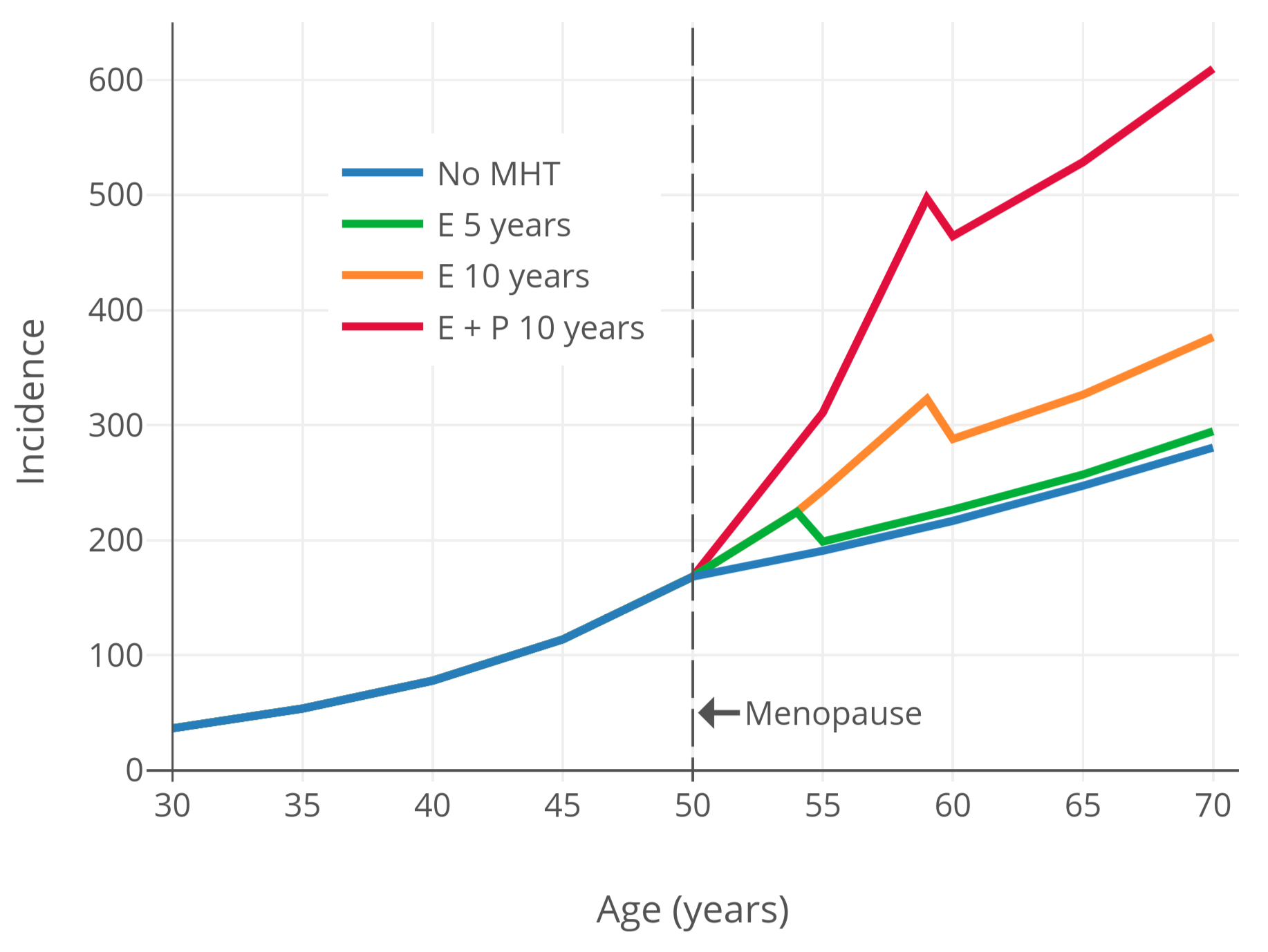 For a visualization of breast cancer risk with menopausal hormone therapy, Figure 2 below shows breast cancer risk over time based on modeling and data from the observational Nurses’ Health Study (NHS) (Colditz & Rozner, 2000). As can be seen, menopausal hormone therapy is associated with maintenance of the age-related exponential rate of increase in breast-cancer risk that is normally blunted by the onset of menopause.
