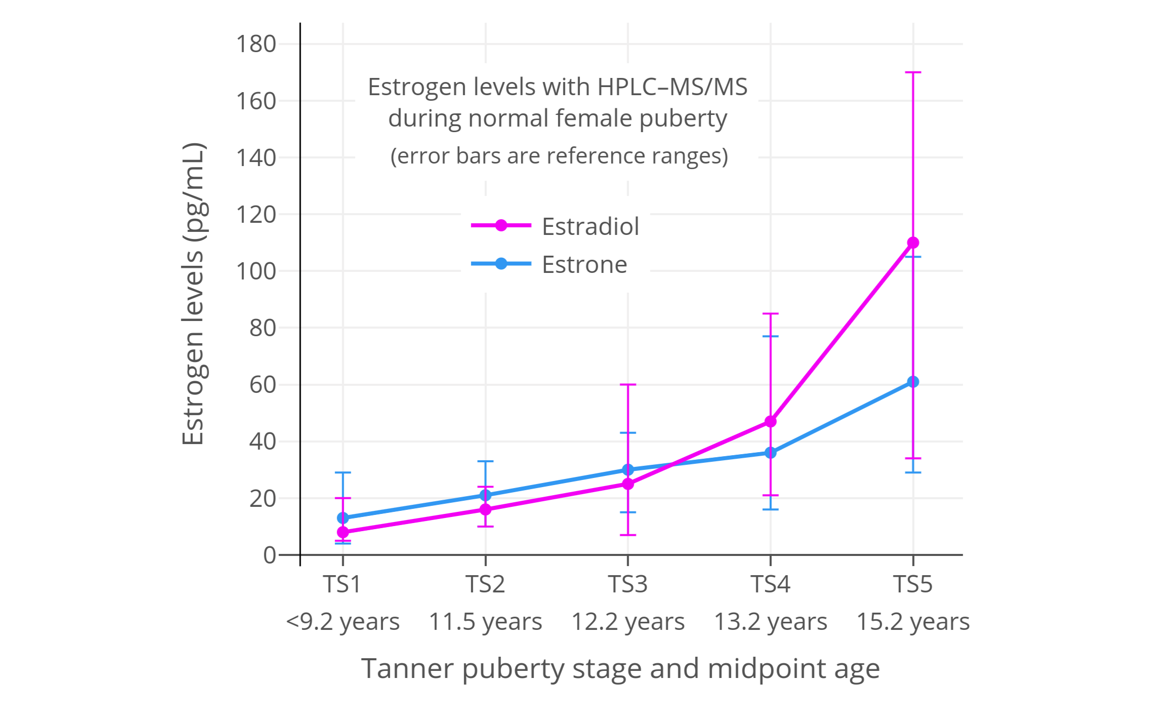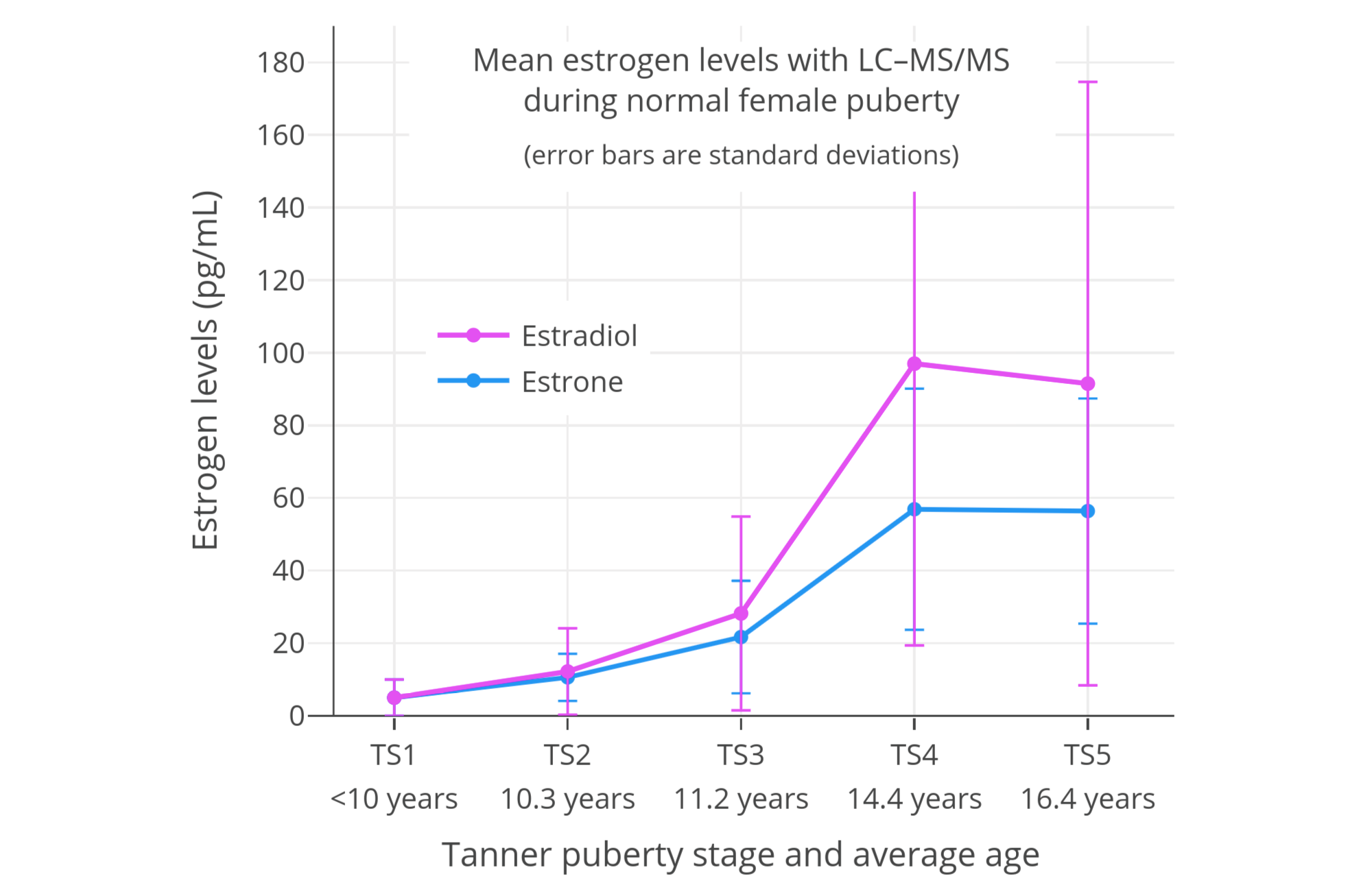 Figure: Mean (± SD) estradiol and estrone levels in normal female puberty (LC–MS/MS):