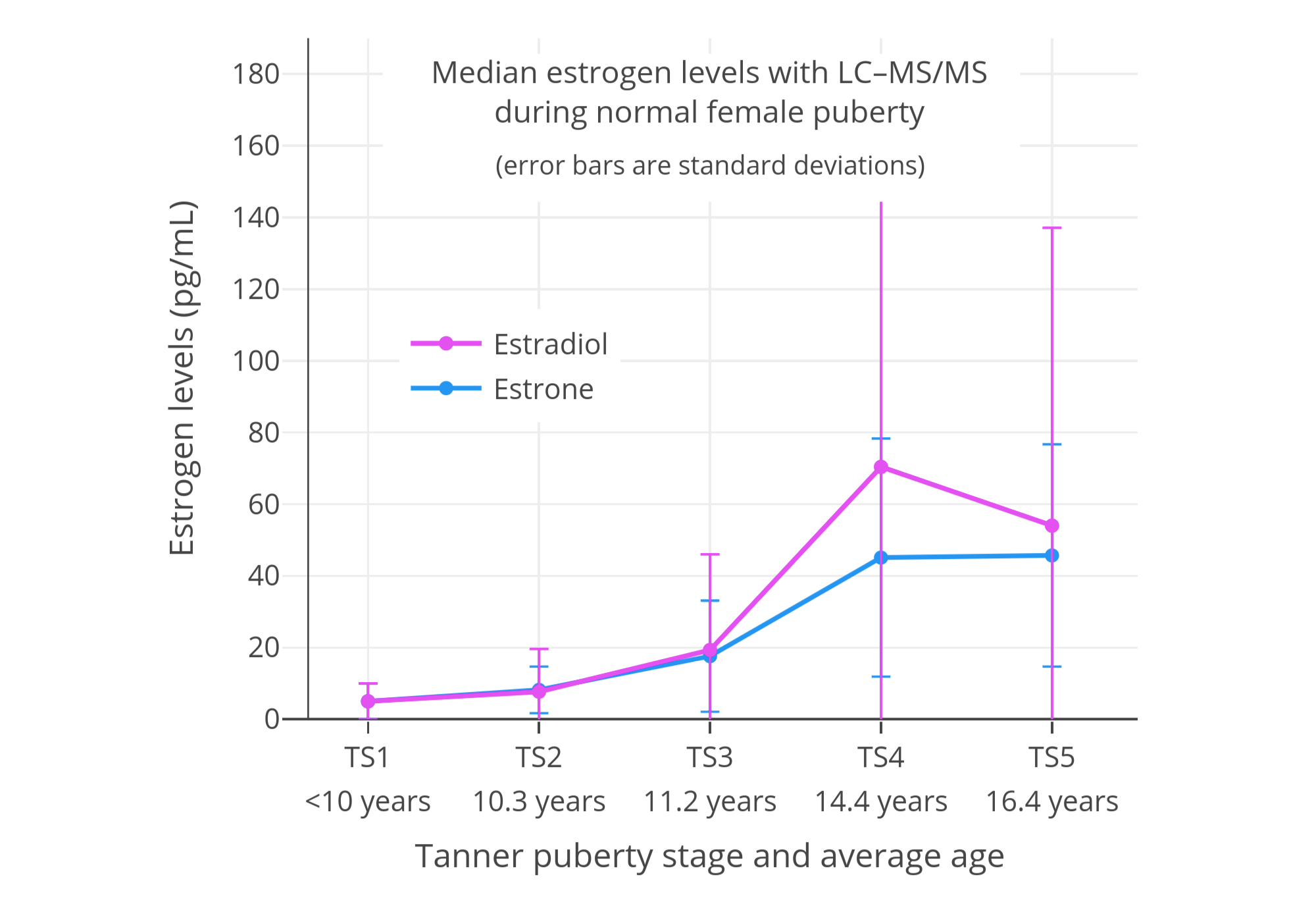 Figure: Median estradiol and estrone levels around puberty in cisgender girls (LC–MS/MS):