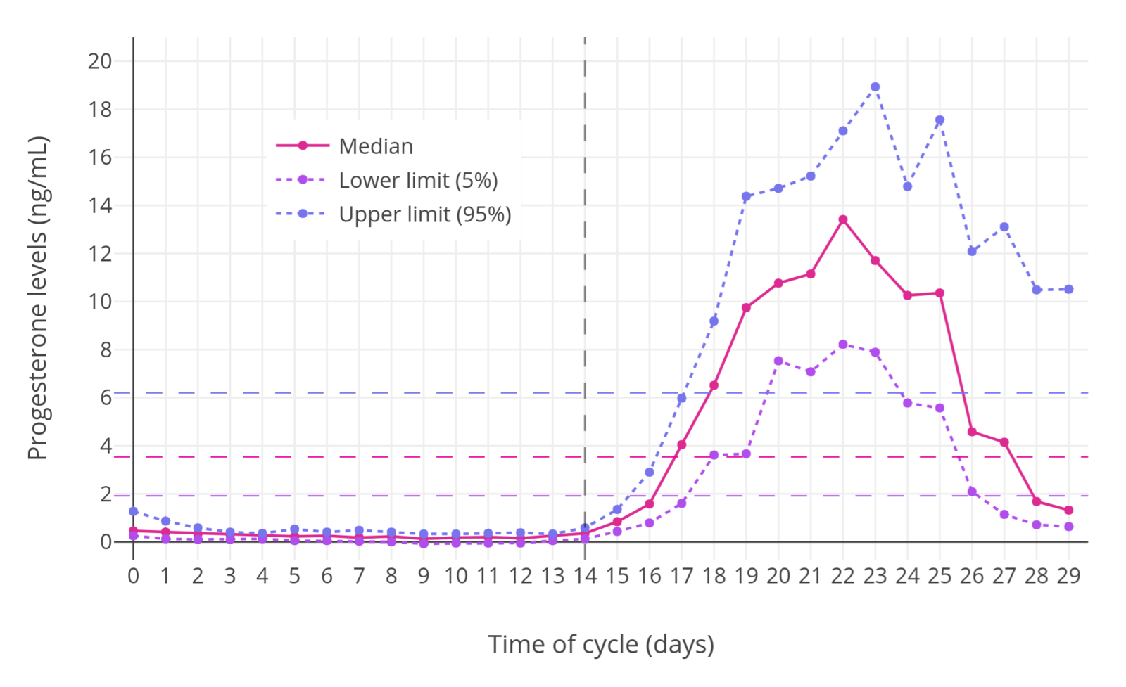 | Figure 1: Progesterone levels during the menstrual cycle in normal premenopausal women (Stricker et al., 2006). The dashed horizontal lines are the mean levels for each curve and the dashed vertical line demarcates mid-cycle (when ovulation occurs). Progesterone levels are normally elevated only during the luteal phase. |