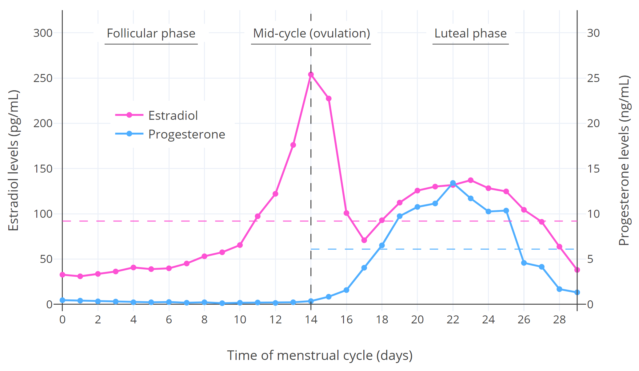 | Figure 1: Median estradiol and progesterone levels throughout the menstrual cycle in premenopausal cisgender women (Stricker et al., 2006; Abbott, 2009). The horizontal dashed lines are the average levels over the spanned periods. Other figures available elsewhere show variation between individuals (Graph; Graph; Graph). |